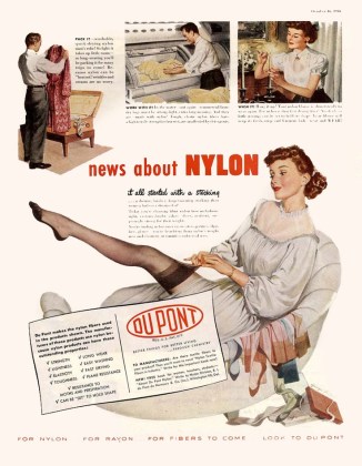 DuPont: Op de wereldtentoonstelling van 1939 in New York presenteerde DuPont het eerste nylon product: dameskousen. De nylons kwamen vanaf 15 mei 1940 in de verkoop en vlogen direct de winkels uit. In het eerste jaar werden maar liefst 64 miljoen nylonkousen verkocht. De deelname van de Amerikanen aan de Tweede Wereldoorlog maakte nylon als materiaal voor parachutes en militaire veiligheidsvesten, enorm populair. Sterk, licht als zijde en in grote hoeveelheden te produceren