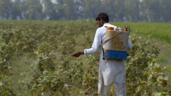 Katoenboer in Uzbekistan, bezig met het besproeien van zijn planten met pesticiden. (foto: The True Cost)