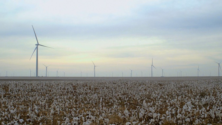 Katoenplantage in de Verenigde Staten. In de jaren zestig wierp de chemische industrie zich op de katoenproductie. Katoen bleek zich uitstekend te lenen voor nieuwe technologieën, zoals plantenveredeling, monoteelt, kunstmest en genetisch gemanipuleerd katoenzaad. Hierdoor kon katoen steeds grootschaliger worden verbouwd. (foto: The True Cost)