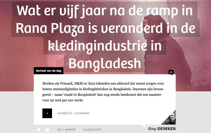 Merken als Primark, H&M en Zara tekenden een akkoord dat moest zorgen voor betere omstandigheden in kledingfabrieken in Bangladesh. Daarmee zijn levens gered – maar ‘made in Bangladesh’ kan nog steeds betekenen dat een naaister voor 30 cent per uur werkt. Lees hier het verhaal.